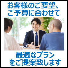 当社ではお客様の立場に立ち、お客様のご要望に最適なプランをご提案させて頂きます。お客様のライフスタイルは様々で、ご予算も様々ですのでぜひ当店の無料出張調査をご利用下さい。